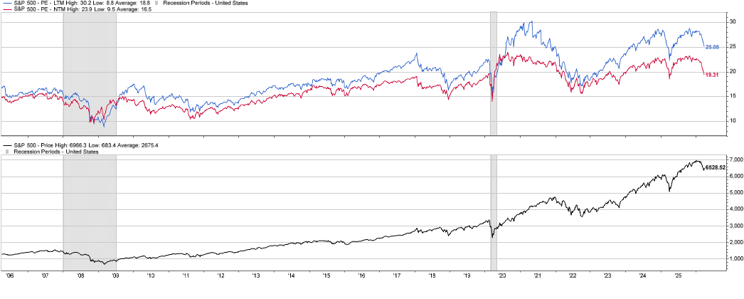 Compare that with 2025 EPS growth for the S&P 500 which was almost double 13%, as well as the forecast (Factset) of 17% EPS growth this year and 16% in 2027. P/Es on 2025 actual and 2026 and 2027 estimates are 25x, 20x and 17x, for PEG ratios of 1.9, 1.2, and 1.1.