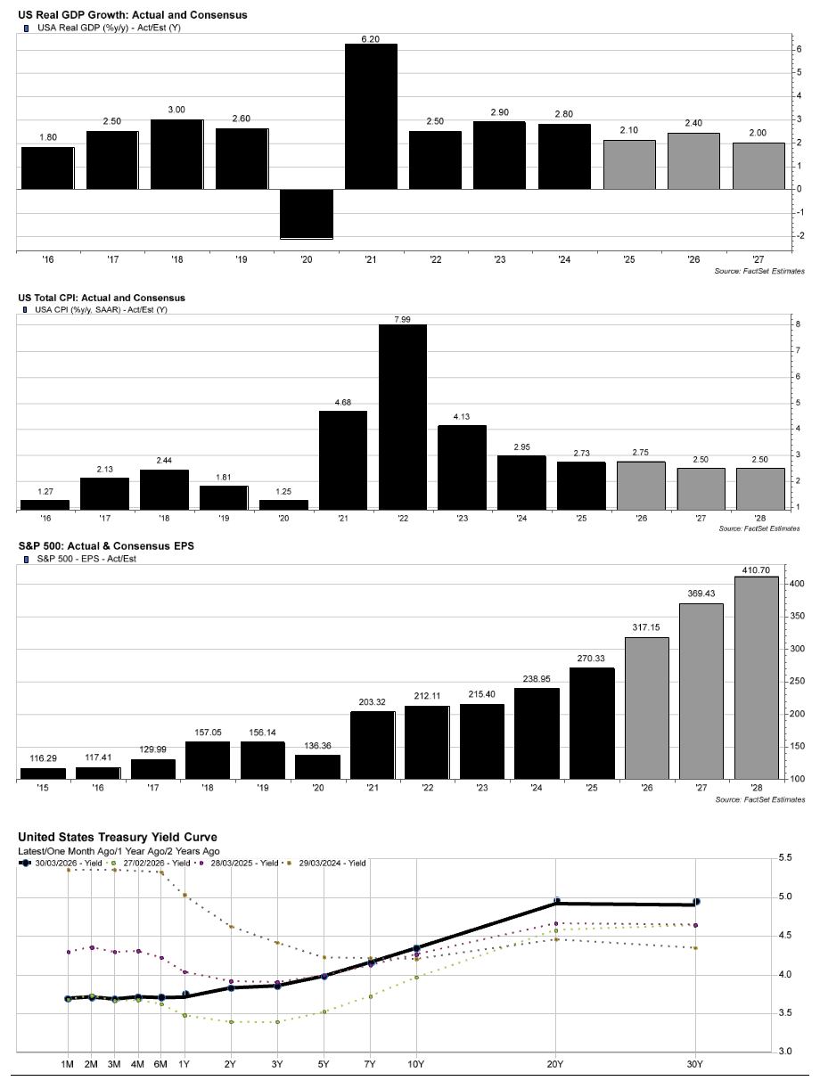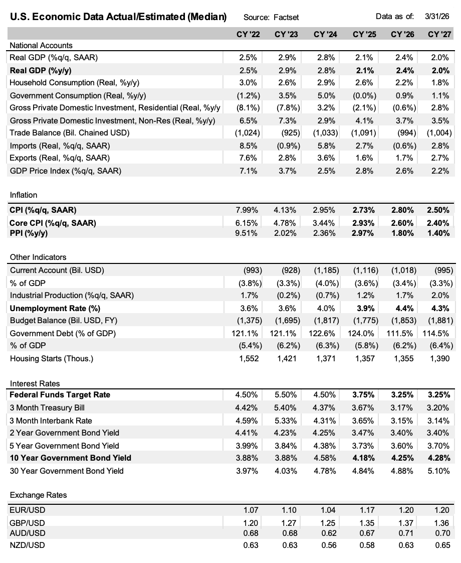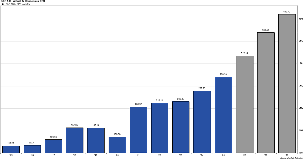 S&P 500 earnings expectations. For 2025, final EPS was $270/share, up 13% vs. 2024. The 2026 estimate is $317 (+17%), 2027 is $369, (+16%), and 2028 is $411 (+11%). P/E ratios for ’26-28 are 20x, 17x and 15x. The P/E-to-Growth (PEG) ratios are 1.2, 1.1 and 1.4. The average EPS growth rate over the past 20 years is 7%; the average trailing and forward P/E ratios are 19x and 17x, while the 20-year average trailing PEG ratio is 2.7x. The consensus price target for the SPX is 8340 vs. 8318 a month ago, and 8158 sixty days ago, for an implied return of +28%. If achieved this calendar year, the implied total return for the S&P 500 in 2026 would be 24%.