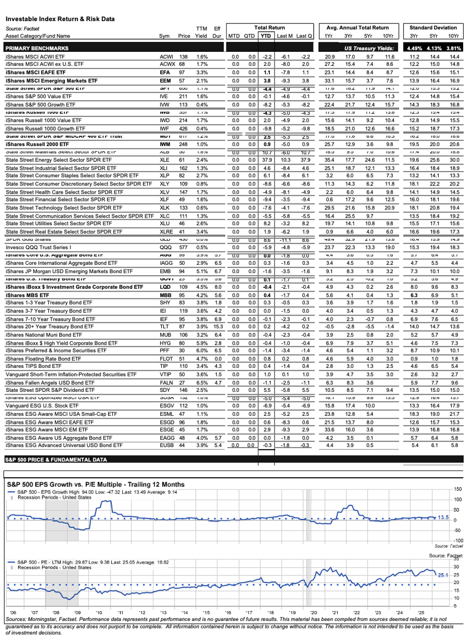 Market conditions and confidence rose again after Q2 earnings results started to come in, as they did not reflect the doom-and-gloom forecasts of many an economist and talking head. Corporate earnings rode a tailwind of stronger-than-expected incomes, spending and net worth, as well as expanding margins and cash flow led by growth companies. Strong earnings results and forecasts continued throughout the rest of the year. Equity returns were strong across the board and led by foreign emerging markets (+34%), foreign developed markets (+31%), and US large cap growth (again, +22%). The S&P 500 rose +18%. Fixed income returns were extremely even across the board and generally well above their long-term averages, buoyed by tapering inflation and overall US economic growth projections (after inflation) of a bit less than 2%. The Aggregate Bond index rose 7%, while 7-10 year Treasurys, investment-grade corporates, mortgage-backed, and high yield bonds all returned 8+% on the year, proving once again that the Chicken Littles (“60/40 is dead”) should remain unheeded.