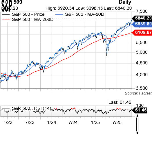P/E ratios for those estimates are 26x, 23x, and 20x. The P/E-to-Growth (PEG) ratios are 2.2, 1.6 and 1.4. The average EPS growth rate over the past 25 years is 11%; the average P/E and PEG ratios are 21x and 1.9. The consensus price target for the SPX is 7741 vs. 7376 a month ago and 7244 sixty days ago, for an implied total return of +13% from its current level. If achieved during this calendar year, the implied total return for the S&P 500 index in 2025 would be +30%.