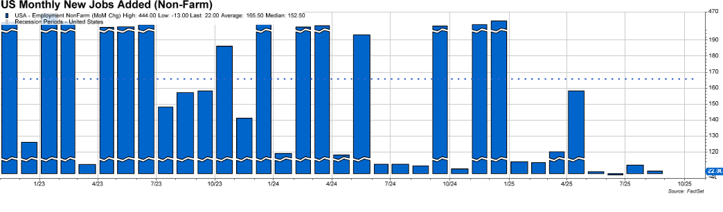 Hopefully Goldilocks won’t die in the process. In order for the Fed to continue its dovish ways, the labor market and broader inflation measures must stay weak “enough”. If employment, wage inflation, and overall price inflation retreat again to a sub-3% level, the Fed can justify more cuts, especially given that the past 30-year average of CPI inflation is 2.9%. Though this level is above the FOMC’s “target” of 2%, the Committee has room to cut if inflation does indeed return to a 2.5% range by 2026-2027, as is currently estimated. What you see below helps the Fed in this regard, as it reflects low, monthly job gains over the four months.