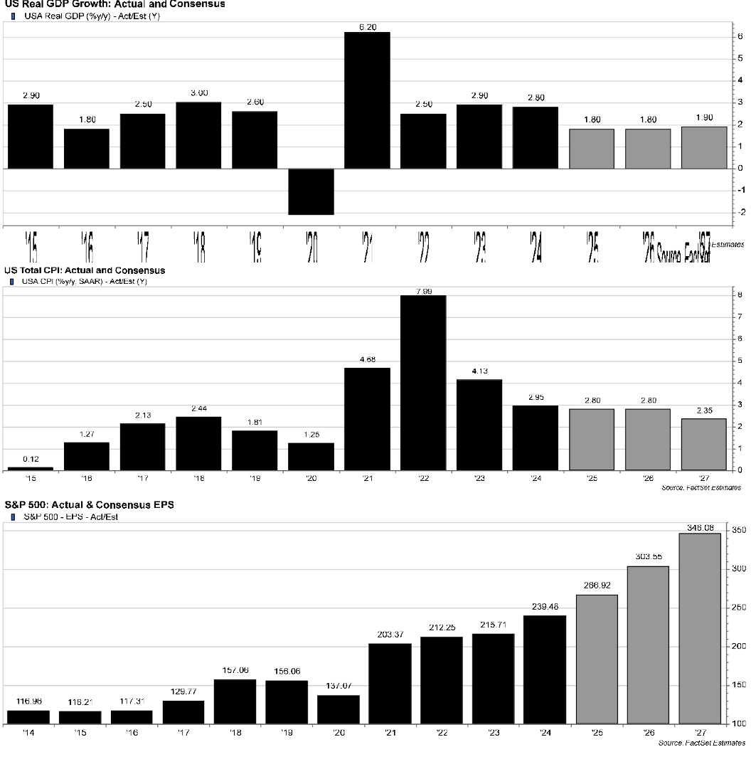 S&P 500 earnings expectations. For 2024, actual EPS was $240/share, up 12% vs. 2023. The 2025 estimate is $267 (+12%), flat vs. a month ago. The 2026 estimate is $304, up $2 over the last month (+14%), with 2027 at $346 (up $4) vs. $341 (+14%). Each annual estimate is higher than it was six and twelve months ago.