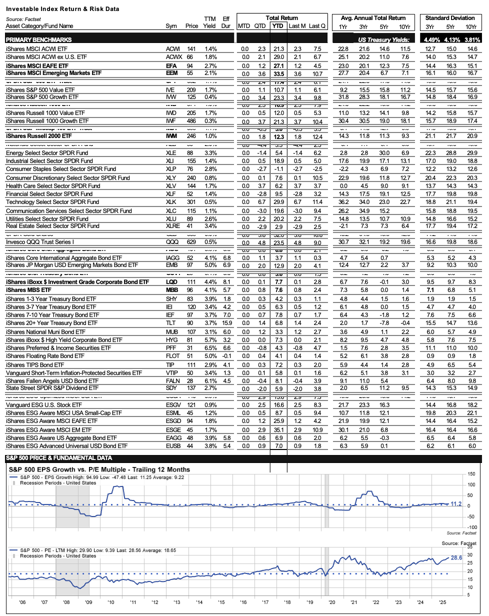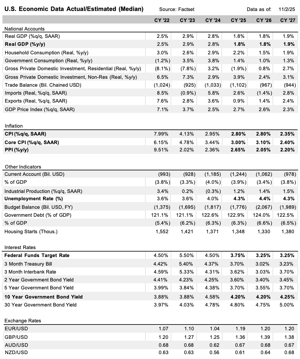 Don’t Fight the Fed...again? At present risk assets have cause to cheer. Cuts to Fed funds are presumably about 2/3rds done since August of last year, when Fed Funds were at 5.25-5.50%. We’ve now seen five rate cuts, the latest last month, and are currently at 3.75-4.00%. Based on current consensus (Factset), expectations are that Fed Funds will cut another 25bp in December, and 50bp in 2026. At that point Fed Funds would stand at 3.00-3.25%, and be just above expected Core inflation by 2026 year end (3.0%).